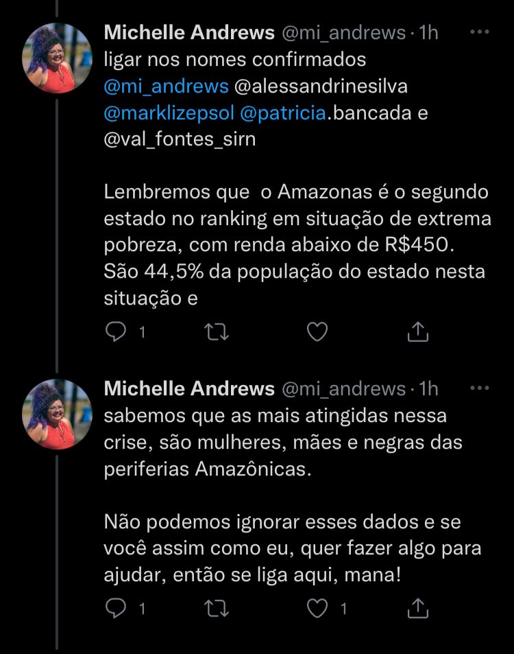 Nas redes sociais, a ativista lembra que, conforme dados do Instituto Brasileiro de Geografia e Estatística (IBGE), o Amazonas é o segundo Estado no ranking em situação de extrema pobreza, com renda abaixo de R$ 450, e as mulheres, mães e negras de periferias são as mais atingidas. Para Michelle Andrews, esses dados não podem ser ignorados.