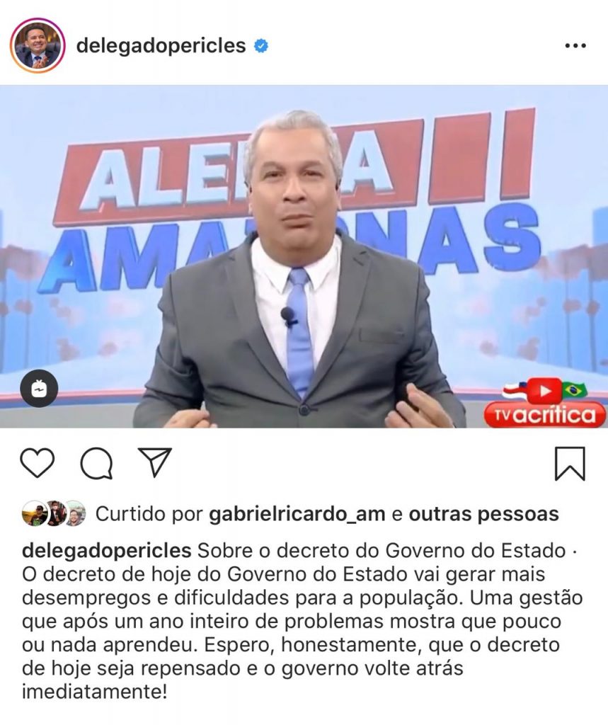 Há cinco dias, Péricles postou em seu instagram um vídeo gravado pelo apresentador de TV, Siqueira Júnior, no qual ele critica o decreto estadual do governo do Amazonas, que restringe o funcionamento do comércio para prevenir novas infecções da Covid-19. A doença registra uma média de mais de 200 casos por dia no Amazonas.