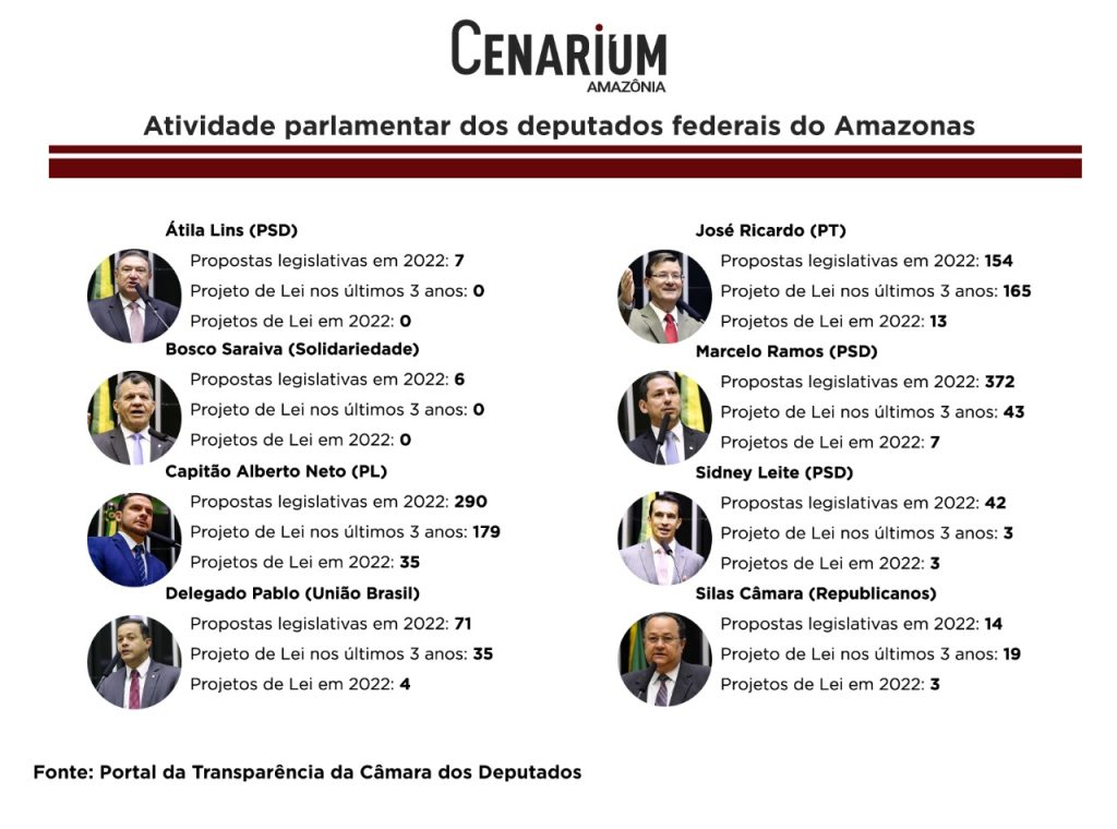 Dados do Portal da Transparência da Câmara dos Deputados mostram que, em 2019, foram 85 PLs apresentados à Câmara, o número aumentou para 129, em 2021, e, em 2022, foram 63 projetos até setembro. Parlamentares como Bosco Saraiva (Solidariedade) e Átila Lins (PSD) não apresentaram nenhum PL neste ano, enquanto o deputado Capitão Alberto Neto (PL) levou 179 PLs à Câmara.