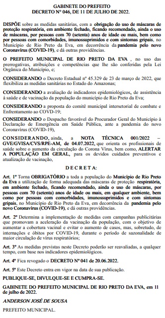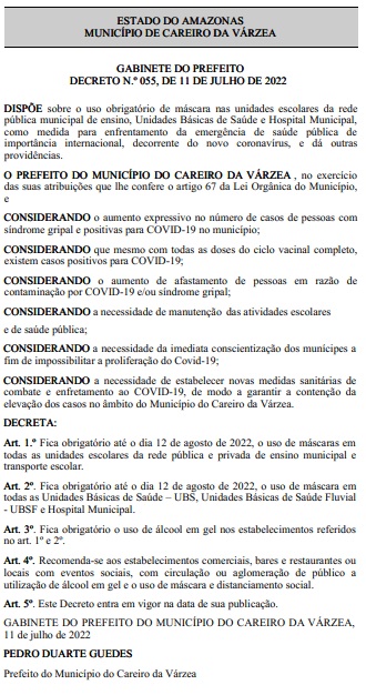 Já no Careiro da Várzea, a prefeitura destaca que observou um aumento expressivo no número de casos de pessoas com síndrome gripal e positivadas para a pandemia no município. “Mesmo com todas as doses do ciclo vacinal completo, existem casos positivos para Covid-19”, diz a prefeitura, em trecho do decreto publicado no DOM.