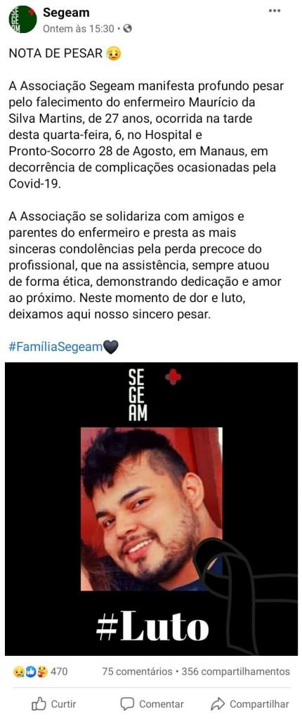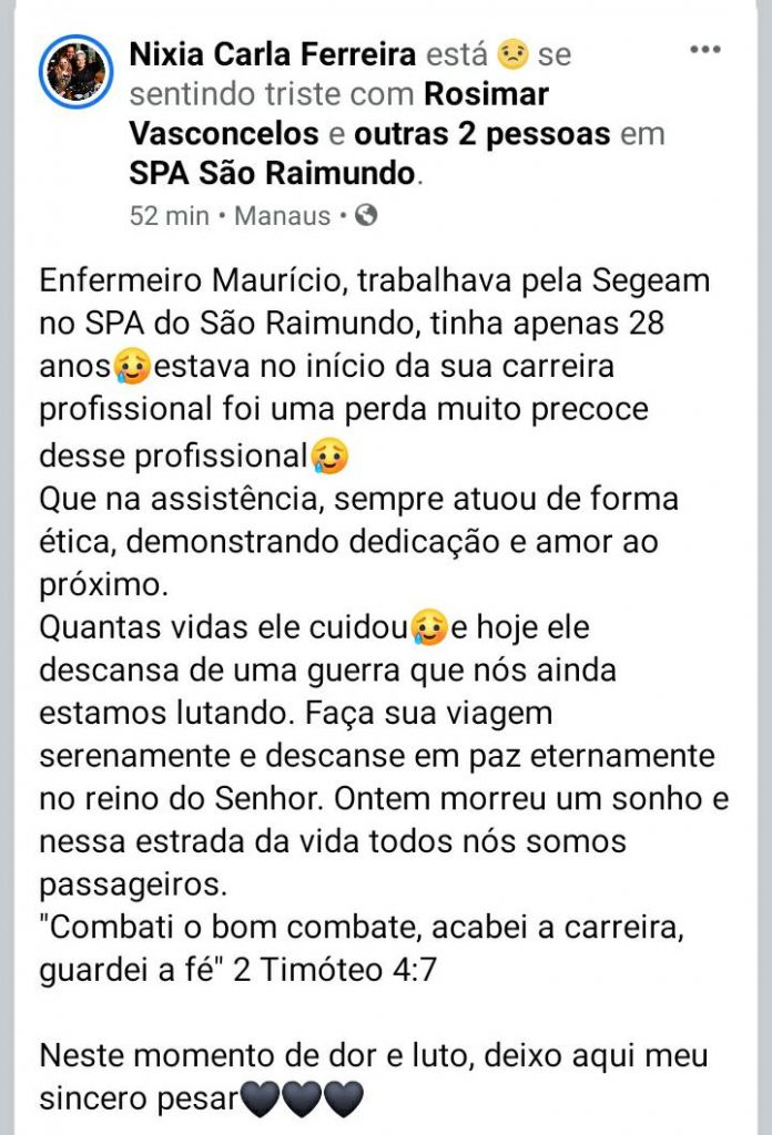 A Associação de Serviços de Enfermagem Geral e Especializado Do Amazonas (Segeam), empresa onde Maurício atuava, também manifestou pesar pela morte do enfermeiro. “A Associação se solidariza com amigos e parentes do enfermeiro pela perda precoce do profissional”, diz em nota.