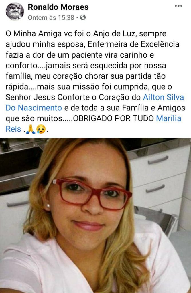 A profissional de saúde morreu por infarto fulminante. Amigos e colegas também publicaram mensagens nas redes sociais de conforto e solidariedade aos familiares.