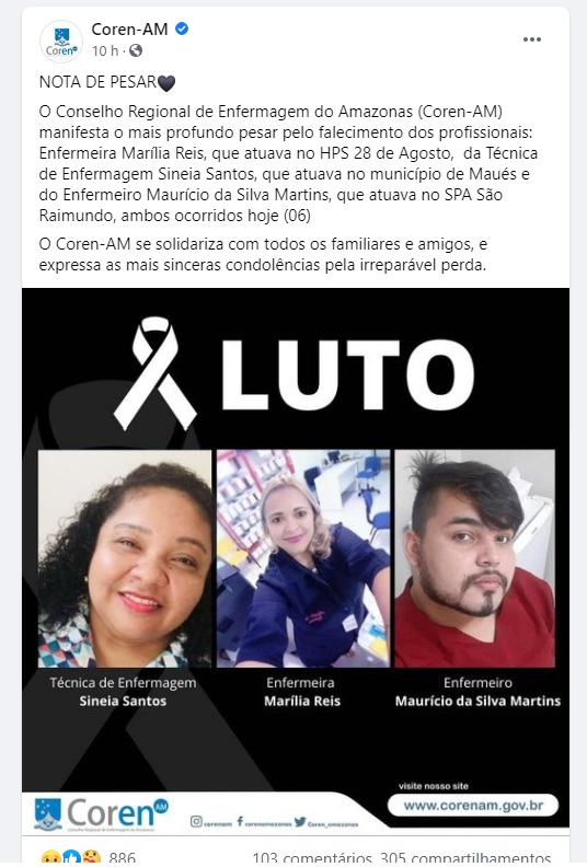 Em nota, o Conselho Regional de Enfermagem do Amazonas (Coren-AM) manifestou pesar pelo falecimento dos profissionais. Segundo o conselho, Maurício atuava no SPA São Raimundo, em Manaus; Sineia Santos atendia no município de Maués (a 259 quilômetros da capital); e Marília trabalhava pelo Hospital e Pronto-Socorro 28 de Agosto, Zona Centro-Sul da capital.