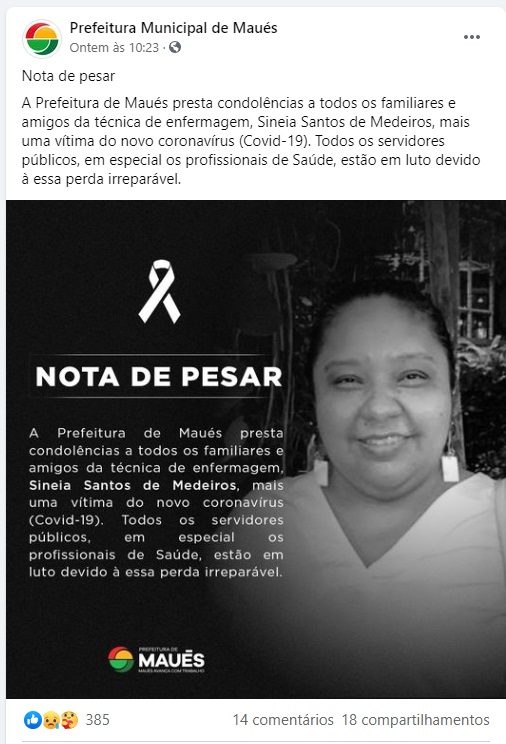 Em nota de pesar, a Prefeitura de Maués prestou condolências aos familiares e amigos da técnica de enfermagem. “Todos os servidores públicos, em especial os profissionais de Saúde, estão em luto devido a essa perda irreparável”, escreveu a Prefeitura.