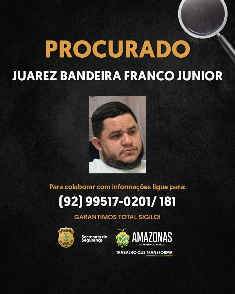 A Polícia Civil do Amazonas (PC-AM) divulgou a imagem de Juarez Bandeira Franco Junior como procurado por lesão corporal no contexto de violência doméstica contra a companheira. Conforme a delegada Mary Anne Mendes Trovão, titular da unidade policial em Manacapuru, equipes policiais já estão a procura do homem.