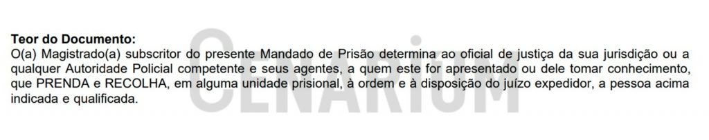 “O (a) magistrado (a) subscritor do presente mandado de prisão determina ao oficial de justiça da sua jurisdição ou a qualquer Autoridade Policial competente e seus agentes, a quem este for apresentado ou dele tomar conhecimento, que prenda e recolha, em alguma unidade prisional, à ordem e à disposição do juízo expedidor, a pessoa acima indicada e qualificada”, consta em trecho do documento.