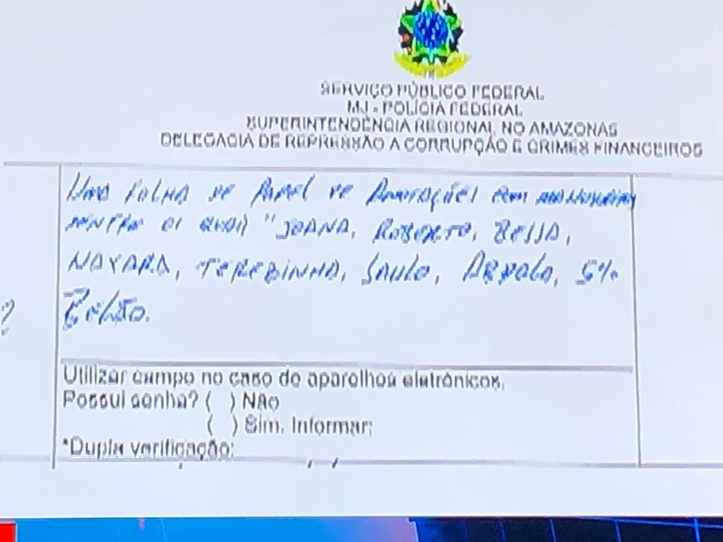 Na noite desta sexta-feira, 4, um papel timbrado da Delegacia de Repressão à Corrupção e Crimes Financeiros (DRCCF), contendo nomes de sete deputados da base governista, foi veiculado primeiramente na CNN Brasil. Na descrição do papel, estão escritos nomes dos deputados que, segundo a reportagem da CNN, foi encontrado no gabinete do governador Wilson Lima pela PF. O documento continha os nomes de “Joana, Roberto, Bessa, Mayara, Terezinha, Saulo, Abdala, 5%, Belão”.