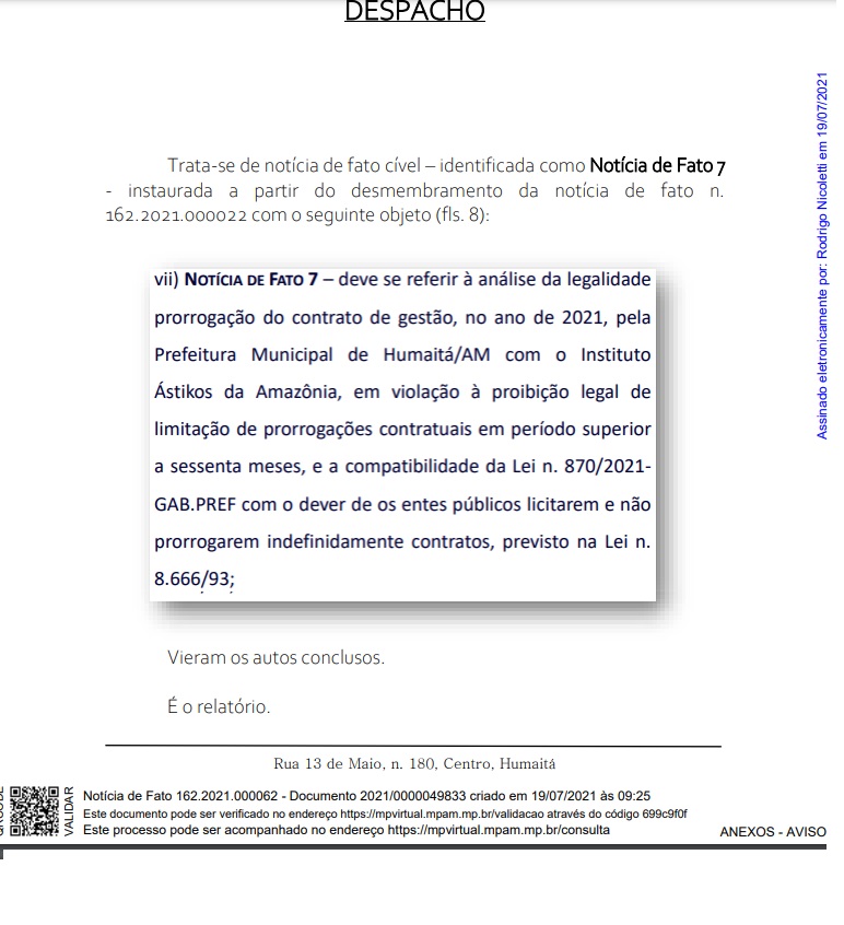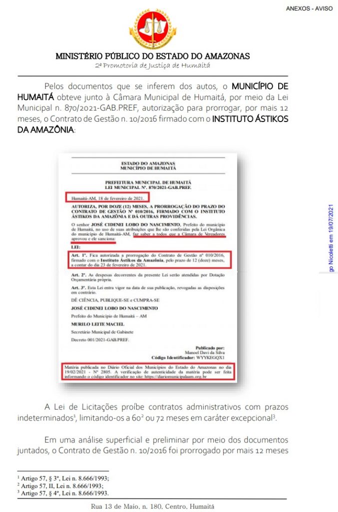 De acordo com o MP-AM, o contrato com o instituto foi prorrogado por 12 meses em 18 de fevereiro deste ano, com aprovação da Câmara de vereadores de Humaitá. A medida foi assinada pelo prefeito do município, José Cidenei Lobo do Nascimento, e publicada no dia 19 no Diário Oficial dos Municípios do Amazonas (DOM). Somente a partir de 23 de fevereiro, o ato começou a valer.