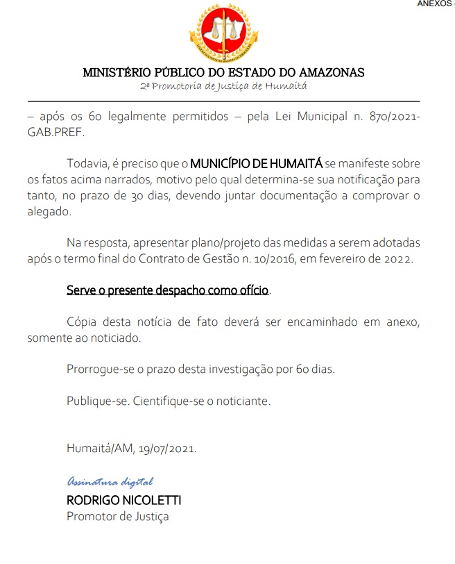 Além da notificação da prefeitura, Rodrigo Nicoletti também determinou que o Executivo Municipal apresente, na resposta ao MP-AM, o plano/projeto das medidas a serem adotadas após o termo final do contrato de gestão n.10/2016, em fevereiro de 2022.