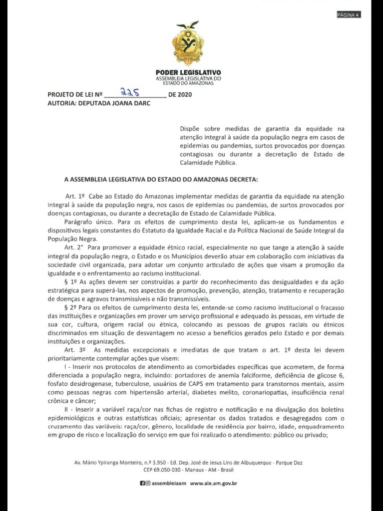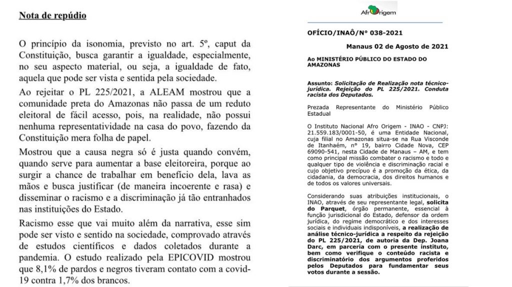 “Ao rejeitar o PL 225/2021, a Aleam mostrou que a comunidade preta do Amazonas não passa de um reduto eleitoral de fácil acesso, pois, na realidade, não possui nenhuma representatividade na casa do povo, fazendo da Constituição mera folha de papel. Mostrou que a causa negra só é justa quando convém, quando serve para aumentar a base eleitoreira, porque ao surgir a chance de trabalhar em benefício dela, lava as mãos e busca justificar (de maneira incoerente e rasa) e disseminar o racismo e a discriminação já tão entranhados nas instituições do Estado”, consta um trecho da nota.