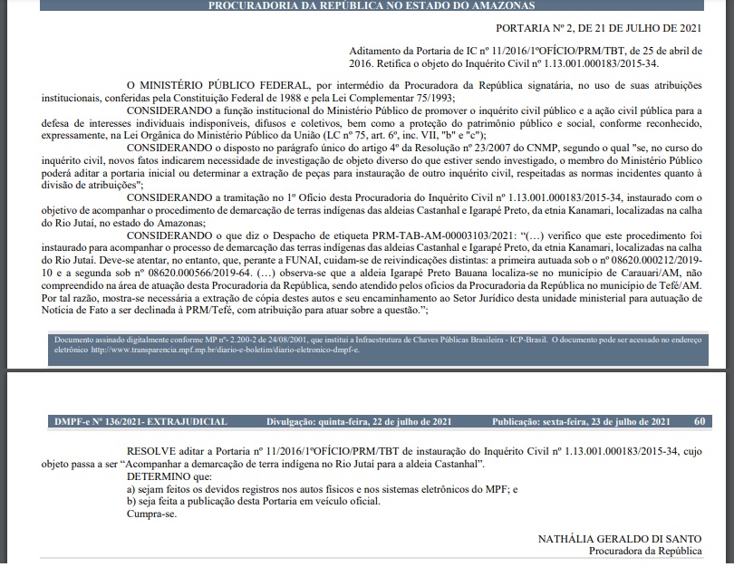A medida é um aditamento da portaria nº 11/2016/1ºOFÍCIO/PRM/TBT, de 25 de abril de 2016, e retifica o Inquérito Civil nº 1.13.001.000183/2015-34, instaurado com o objetivo de acompanhar o procedimento de demarcação de terras indígenas das aldeias Castanhal e Igarapé Preto, da etnia Kanamari, na calha do rio Jutaí.