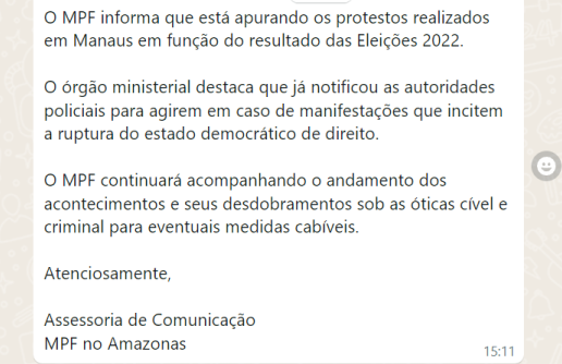 Em nota, o MPF informou que está apurando os protestos em Manaus. O órgão ministerial destacou que já notificou as autoridades policiais para agirem em caso de manifestações que incitem a ruptura do estado democrático de direito e que vai continuar acompanhando os acontecimentos e seus desdobramentos.
