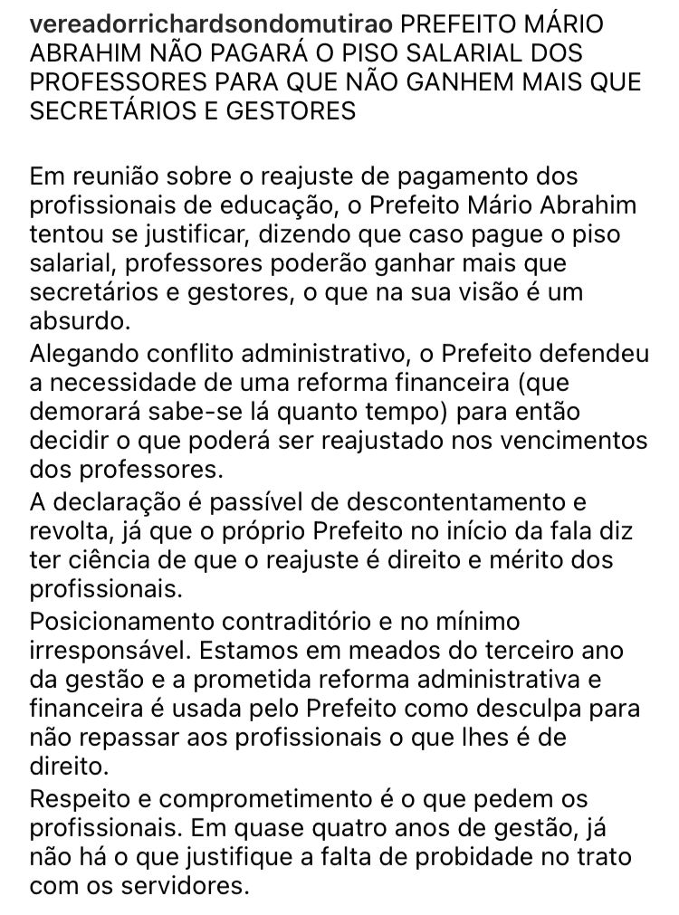 O vereador Richardson do Mutirão (PL) afirmou que a declaração do prefeito é contraditória, irresponsável e “passível de descontentamento e revolta”, já que o próprio prefeito diz ter ciência de que o reajuste é direito e mérito dos profissionais. O parlamentar foi às redes sociais mostrar insatisfação com a postura de Abrahim.