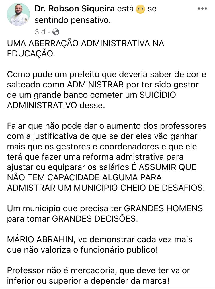 “Um município que precisa ter grandes nomes para tomar grandes decisões. Mário Abrahim, você demonstra, cada vez mais, que não valoriza o funcionário público. Professor não é mercadoria, que deve ter valor inferior ou superior, a depender da marca. […] Por que não pode ganhar mais que gestor?!”, questiona.