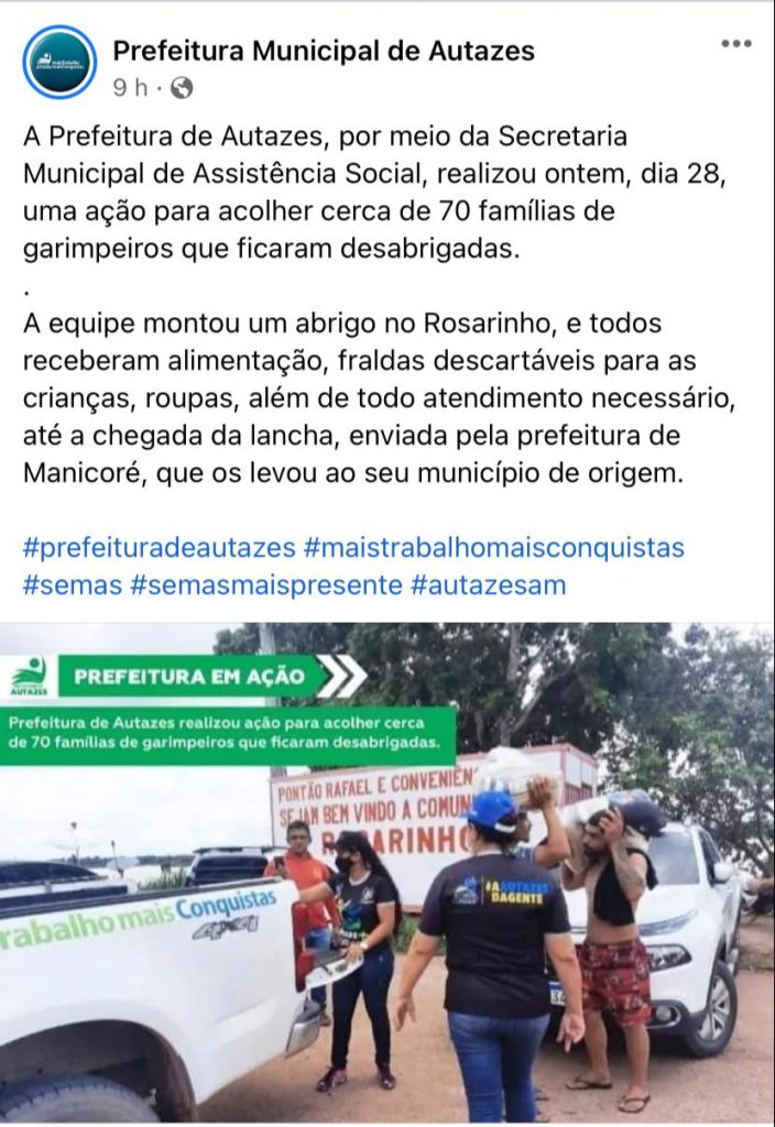 No domingo, 28, a Prefeitura de Autazes, por meio da Secretaria Municipal de Assistência Social, realizou uma ação para acolher cerca de 70 famílias de garimpeiros que ficaram desabrigadas. Segundo a prefeitura, foi montado um abrigo em uma região do município.