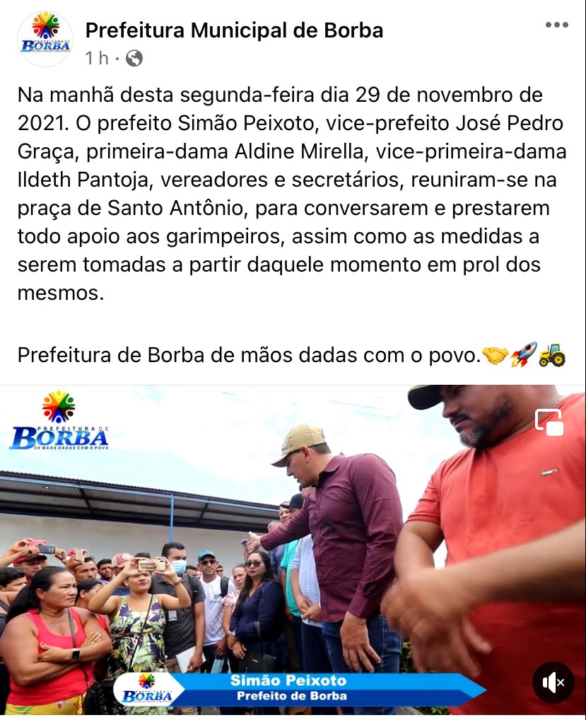 Em Borba, o prefeito da cidade Simão Peixoto (PP) afirmou, nesta segunda-feira, 29, que buscou a bancada federal do Amazonas para paralisar a destruição das balsas de garimpo na região. Em pronunciamento aos garimpeiros, Peixoto reconheceu a atividade ilegal, mas disse que é necessária uma comissão para legalizar o garimpo.