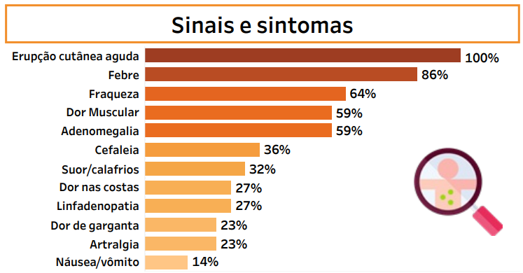 Os sintomas da doença se assemelham à uma gripe, como febre, dor de cabeça e dor no corpo, calafrios, exaustão, que podem durar em média três dias. Na fase seguinte é que aparecem as lesões na pele que evoluem em cinco estágios, conhecidos como mácula, pápulas, vesículas, pústulas e então, crostas, estágio final quando caem. É o contato com elas que causa a transmissão do vírus para outras pessoas.