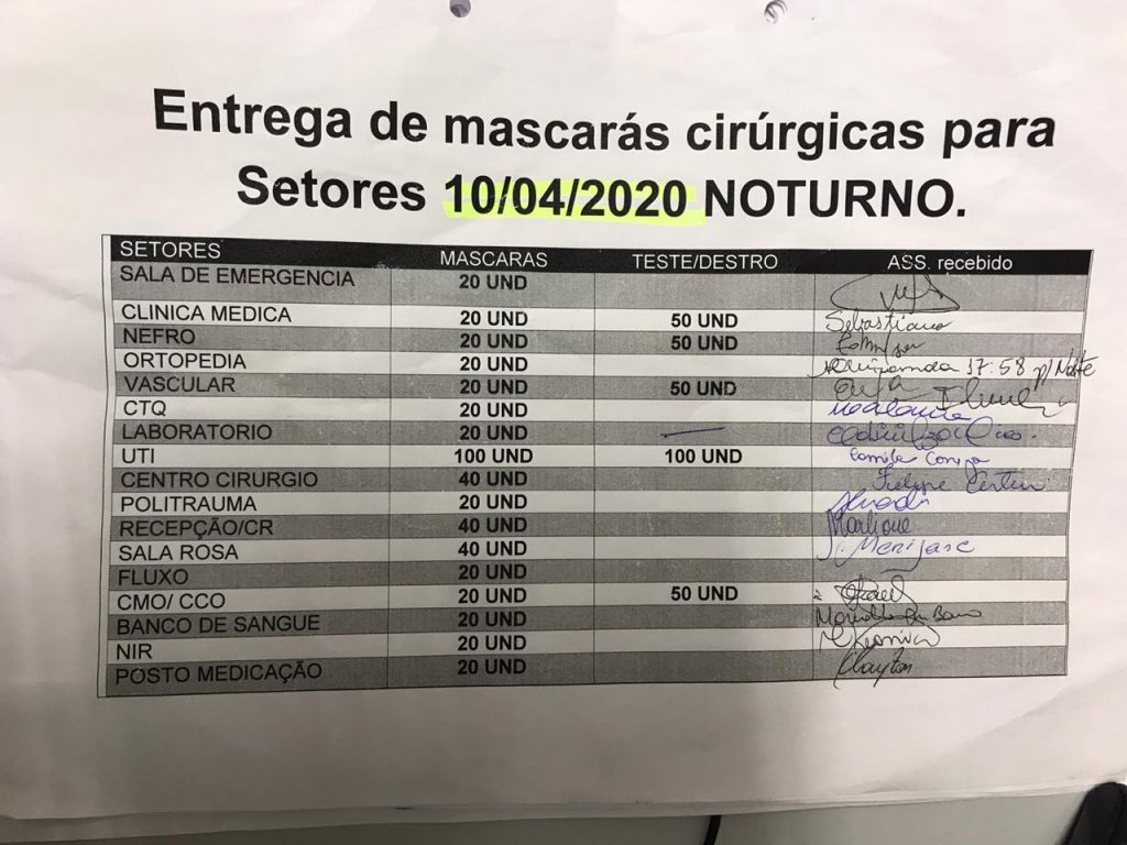 Sobre a falta de EPIs, um vídeo gravado por uma funcionária do hospital, que entrou em contato com a reportagem, mostra que foram entregues pela Central de Medicamentos (CEMA), no dia 24 deste mês, 1,6 mil aventais cirúrgicos, sete mil máscaras de modelos variados e 100 ‘face shield’ (protetores faciais/viseiras). A profissional tomou a iniciativa por repudiar a postura do técnico, que compromete a equipe de enfermagem.