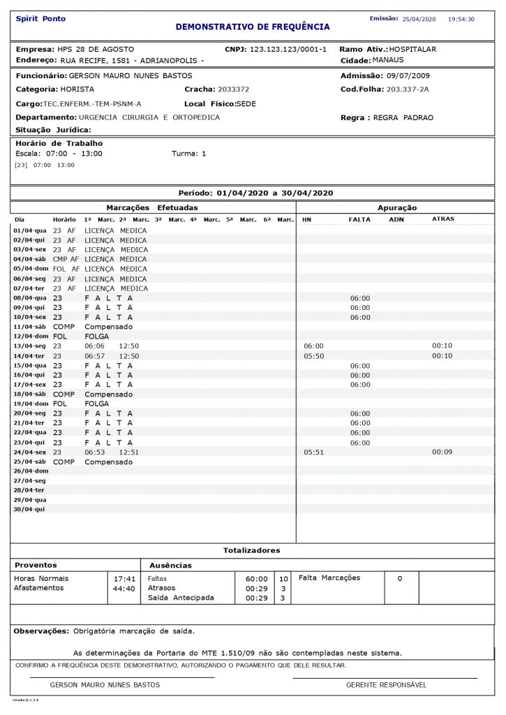 Outra informação repassada à REVISTA CENARIUM é que a entrega de máscaras e demais EPIs aos setores é assinada e protocolada na unidade hospitalar, para melhor controle e uso racional dos equipamentos. Em abril, pelo menos em sete datas diferentes, ocorreu a reposição dos produtos. Dias 5, 6, 7, 8, 10, 11 e 14. Desses, apenas nos dias 11 e 14, Gerson estava no hospital. Nos demais dias, ele estava ausente amparado em atestado médico ou sem apresentar justificativa.