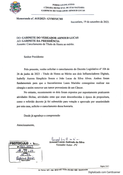MANAUS – O vereador Arnoud Lucas Andrade da Silva (PV), do município de Itacoatiara, a 175 quilômetros de Manaus, capital do Amazonas, quer cancelar o título de honra ao mérito aos influenciadores Isabelly Aurora Simplício Souza e João Lucas da Silva Alves, conhecido como “Lucas Picolé”, indiciados por envolvimento em esquema de venda ilegal de rifas na internet. A concessão do título foi aprovada, por unanimidade, em junho deste ano, em razão da doação de R$ 200 mil à itacoatiarense Laura Marinho, diagnosticada com câncer.