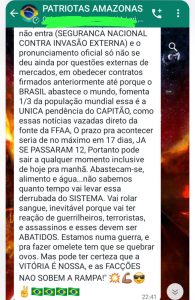 Em grupos de aplicativo de mensagens ainda circulam mensagens afirmando que, em algum momento, o “sistema vai cair” por ações das Forças Armadas. No grupo “Patriotas Amazonas“, um membro afirma que vai “rolar sangue” e que o objetivo é impedir que os eleitos tomem posse. “Vai rolar sangue, inevitável porque vai ter reação de guerrilheiros, terroristas e assassinos e esses devem ser abatidos“, diz em uma mensagem.