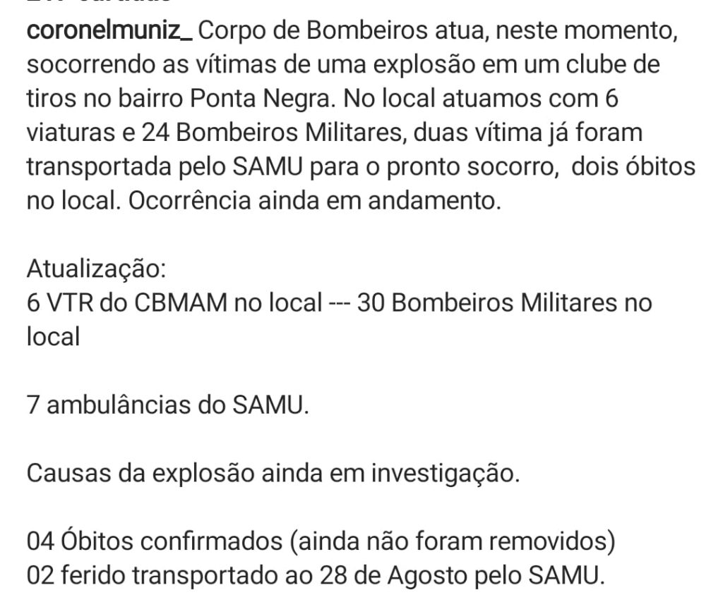 “O Corpo de Bombeiros atua, neste momento, socorrendo as vítimas de uma explosão em um clube de tiro no bairro Ponta Negra. No local, atuamos com seis viaturas, Bombeiros Militares, duas vítimas já foram transportadas pelo Samu para o pronto-socorro, dois óbitos no local. Ocorrência ainda em andamento“, informou.
