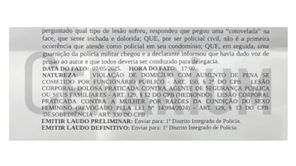 O militar, que não estava de serviço, foi flagranteado pelos crimes de violação de domicílio, com aumento de pena se cometido por funcionário público; lesão corporal dolosa praticada contra agente de segurança pública ou seus familiares; lesão corporal praticada contra a mulher por razões da condição do sexo feminino; e desobediência.
