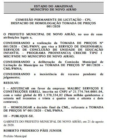 MANAUS – A Prefeitura de Novo Airão (a 190 quilômetros de Manaus) pretende destinar R$ 1,5 milhão a uma empresa privada para concluir a construção de uma creche na cidade. O despacho do contrato foi assinado pelo prefeito Roberto Frederico Júnior e publicado na última segunda-feira, 24, no Diário Oficial dos Municípios (DOM).