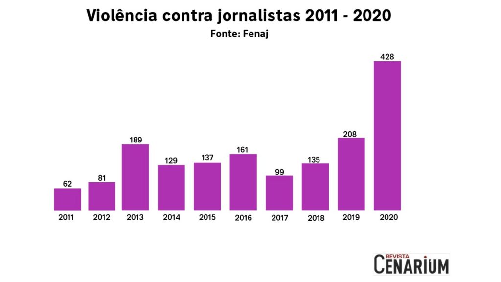 Relatório divulgado no início deste ano pela Federação Nacional de Jornalistas (Fenaj), elaborado em 2020, apontou que o ano passado foi o mais violento para profissionais de imprensa desde 1990, quando o levantamento começou a ser feito pela Federação. Foram 428 casos de ataques – incluindo dois assassinatos – o que representa um aumento de 105,77% em relação a 2019, ano em que também houve crescimento das violações à liberdade de imprensa no País.