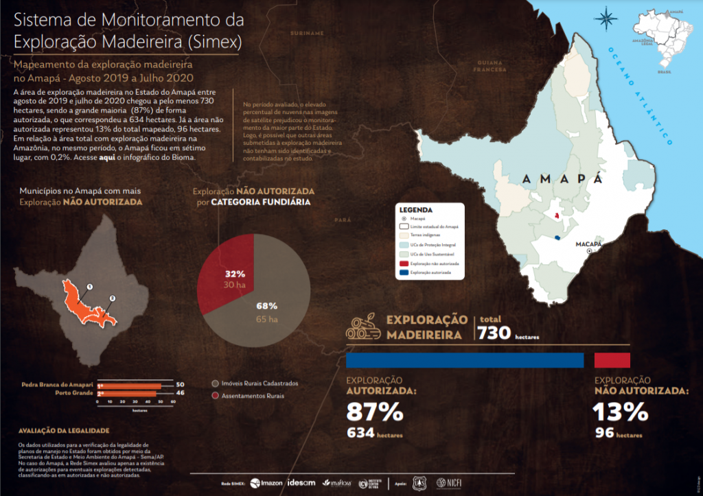 O levantamento foi realizado a partir de informações cedidas pela Secretaria de Estado do Meio Ambiente do Amapá (Sema) à Rede Simex, ferramenta de monitoramento da Amazônia que é integrada pelo Instituto do Homem e Meio Ambiente da Amazônia (Imazon), Instituto de Conservação e Desenvolvimento Sustentável da Amazônia (Idesam), Instituto de Manejo e Certificação Florestal e Agrícola (Imaflora) e Instituto Centro de Vida (ICV).