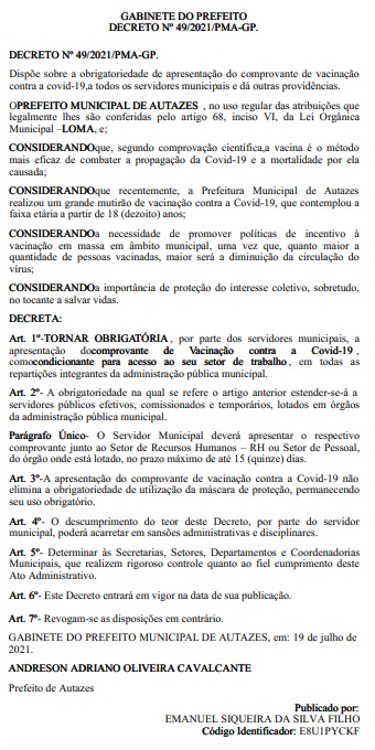 Veja a publicação do decreto que obriga os funcionários a apresentarem o comprovante: