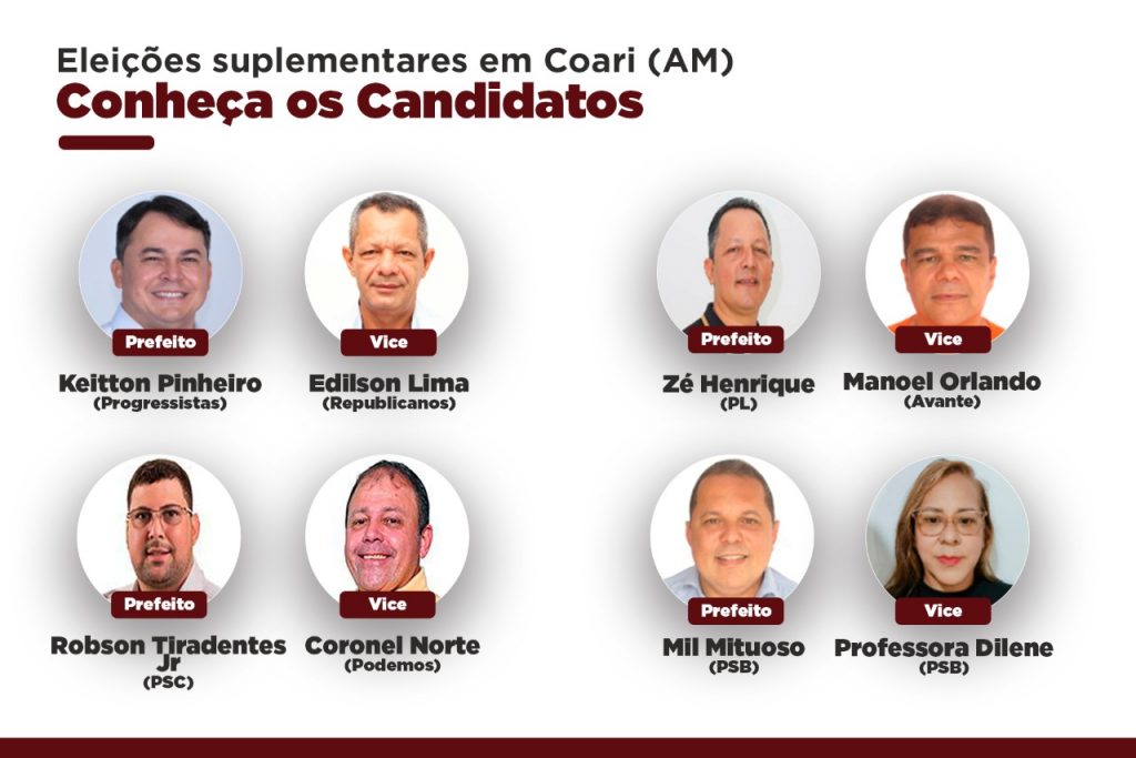 MANAUS – No interior do Amazonas, o município de Coari (a 363 quilômetros de Manaus) realiza, neste domingo, 5, as eleições suplementares que decidem os novos gestores que vão comandar a cidade pelos próximos três anos. Os candidatos a prefeito e vice-prefeito, respectivamente, que concorrem no pleito de 2021 são Robson Tiradentes Jr (PSC) e Coronel Norte (Podemos); Keitton Pinheiro (Progressistas) e Edilson Lima (Republicanos); Zé Henrique (PL) e Manoel Orlando (Avante); e Mil Mitouso (PSB) e Professora Dilene (PSB).