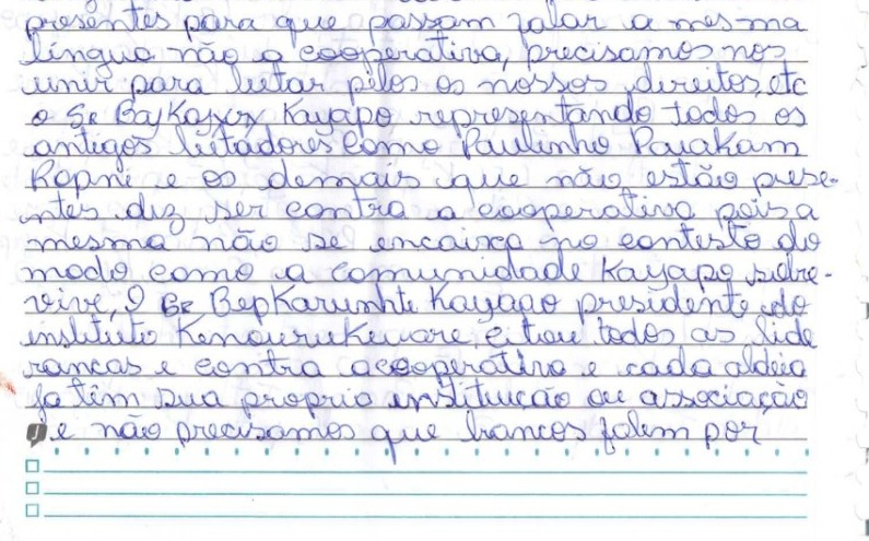 “Não precisamos que brancos falem por nós”, diz trecho da carta contra a cooperativa escrita por lideranças indígenas durante reunião realizada na aldeia Kayapó Kanhkro, município de Ourilândia do Norte, no Pará, em março de 2021.
