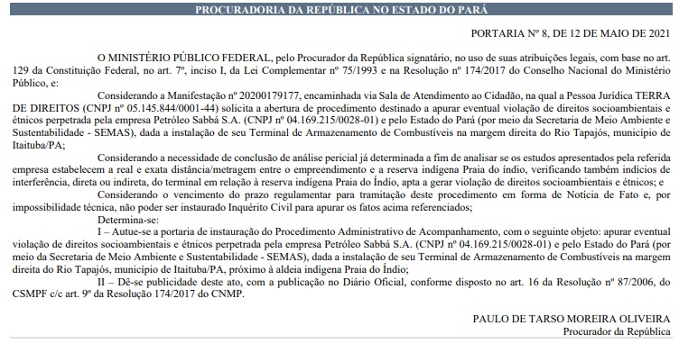 Confira, na íntegra, a portaria do MPF-PA: