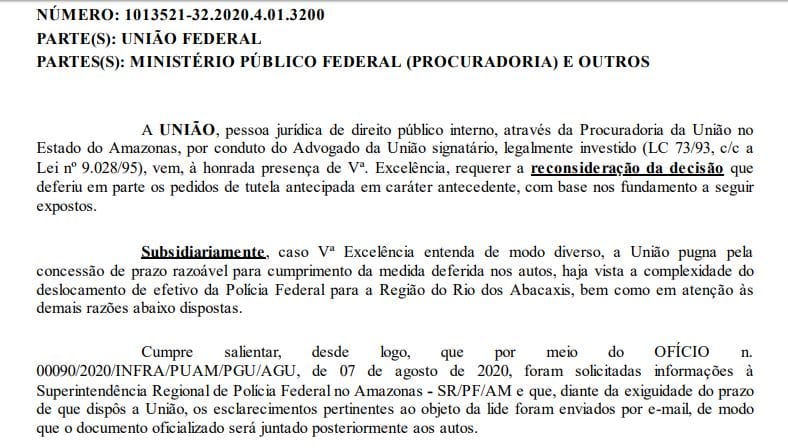 A informação consta em pedido de reconsideração, à Justiça Federal, de decisão liminar que autorizou o emprego de policiais federais na área onde ocorre uma operação do Estado, localizada entre os municípios de Nova Olinda do Norte e Borba.