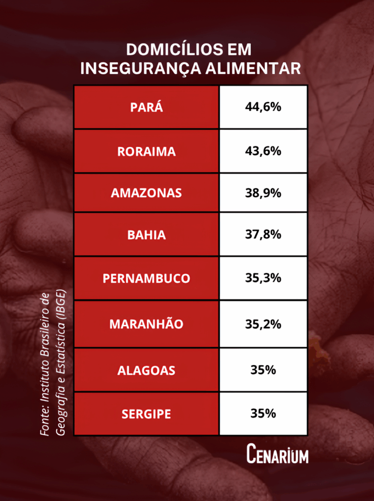 Entre os Estados com os maiores percentuais de domicílios em insegurança alimentar também estão três Unidades Federativas (UFs) da Região Norte: Pará (44,6%), Roraima (43,6%) e Amazonas (38,9%), seguidos por Estados do Nordeste, Bahia (37,8%), Pernambuco (35,3%), Maranhão (35,2%), Alagoas (35%) e Sergipe (35%).