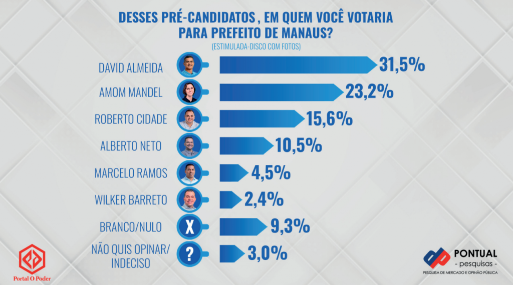MANAUS (AM) – A quarta pesquisa eleitoral de intenções de voto para a Prefeitura de Manaus, divulgada nesta sexta-feira, 2, pelo instituto Pontual Pesquisas, mostra Amom Mandel (Cidadania) em queda na corrida pela segunda posição, enquanto Roberto Cidade (UB) se aproxima para brigar por um possível segundo turno contra o atual prefeito e pré-candidato à reeleição, David Almeida (Avante), que aparece na primeira colocação (31,5%) na sondagem de opinião.