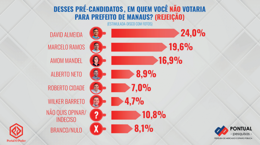 Respondendo o questionamento “Desses pré-candidatos, em quem você não votaria para prefeito de Manaus?”, a liderança de rejeição continua com David Almeida, com 24% dos entrevistados preferindo que o prefeito não seja reeleito, número 1,7% maior desde a última divulgação. Em segundo lugar, Marcelo Ramos aparece com 19,6%, seguido de Amom Mandel, que marca 16,9%, candidato com a maior rejeição em crescimento registrada desde a última pesquisa, cuja alta chega a 7,1%.