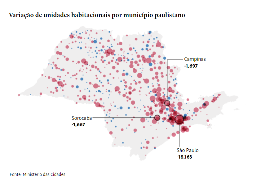 A maioria dessas casas e apartamentos está no estado de São Paulo, que acumula 270 mil imóveis enquadrados no programa. Em seguida vêm Minas Gerais, com 79,6 mil unidades, e Paraná, com 68 mil residências.