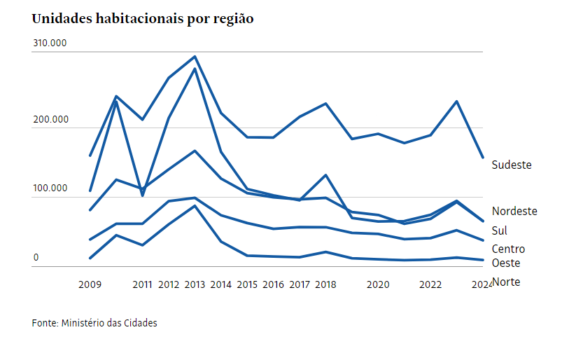 “A segunda razão, especialmente no Norte, é que material de construção é mais caro por razão logística. O acesso é mais difícil, o que torna material de construção bem mais caro. Nesse caso, o ideal é que métodos construtivos com madeira possam ser homologados por lá e para isso é necessária a atuação de diversos órgãos“, sugeriu.O Ministério das Cidades não respondeu a questionamentos feitos pela Folha.