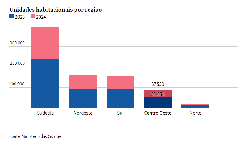 Quase metade das residências contratadas no novo Minha Casa, Minha Vida está no Sudeste. São 396 mil unidades de um total de 826 mil anunciadas desde a retomada do programa, em 2023.