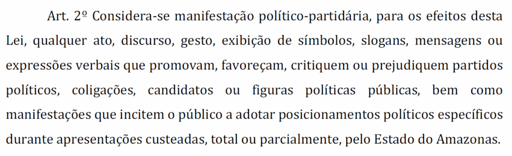 O PL considera como manifestação político-partidária “qualquer ato, discurso, gesto, exibição de símbolos, slogans, mensagens ou expressões verbais que promovam, favoreçam, critiquem ou prejudiquem partidos políticos, coligações, candidatos ou figuras políticas públicas, bem como manifestações que incitem o público a adotar posicionamentos políticos específicos durante apresentações custeadas, total ou parcialmente, pelo Estado do Amazonas“.