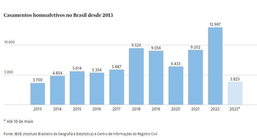 De lá para cá, o número de matrimônios entre homo ou bissexuais brasileiros quadruplicaram. Em 2013, primeiro ano de obrigatoriedade nacional, ocorreram 3.700 celebrações. Já em 2022, foram 12.987. O levantamento é da Associação Nacional dos Registradores de Pessoas Naturais, que responde pelos cartórios.