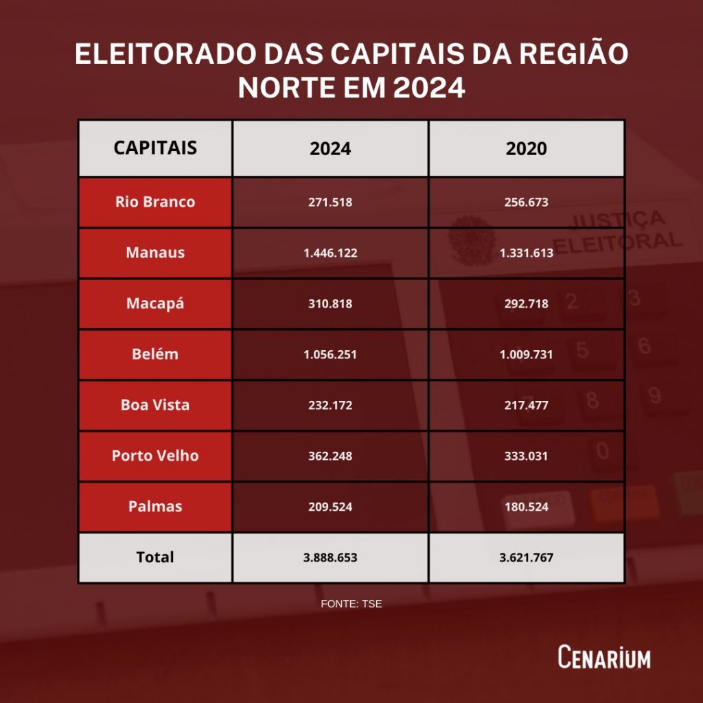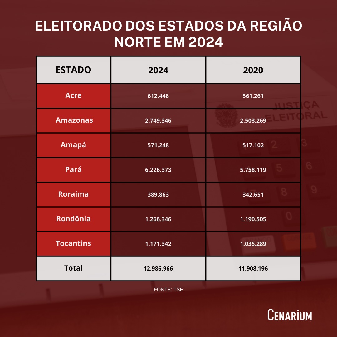 O Pará segue como o Estado com o maior número de eleitores passando de 5,7 milhões, na última eleição municipal, para 6,2 milhões no pleito deste ano. Em seguida está o Amazonas, que saiu de 2,5 milhões para 2,7 milhões, em 2024.