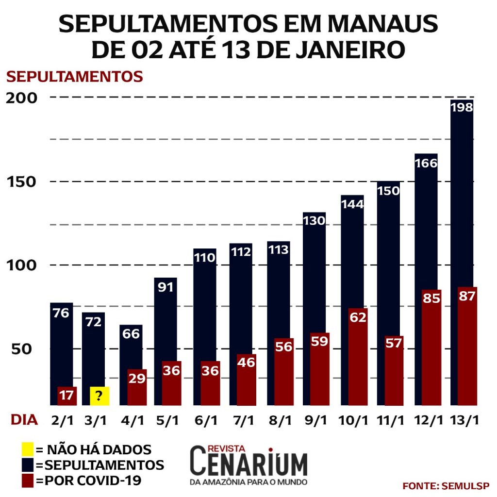 De acordo com o Informe Funerário divulgado diariamente pela Prefeitura de Manaus, a quarta-feira registrou também o maior número de sepultamentos por Covid-19 neste ano, foram 87 óbitos tendo a doença como causa. Ao todo, a capital já registrou 1.428 sepultamentos nos primeiros 13 dias de 2021.