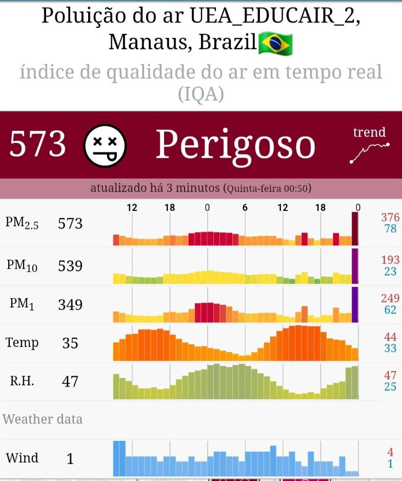 MANAUS – A qualidade do ar em Manaus atingiu o nível mais crítico, segundo índice do World Air Quality Index (Índice de Qualidade do Ar Mundial), da Agência Mundial de Proteção Ambiental. O nível “perigoso” ocorre quando o parâmetro ultrapassa 300. Na madrugada desta quinta-feira, 5, em Manaus, esse índice ultrapassou os 500 pontos, e gerou um alerta de saúde: “todos podem sofrer efeitos mais graves para a saúde e devem evitar todos os esforços ao ar livre”.