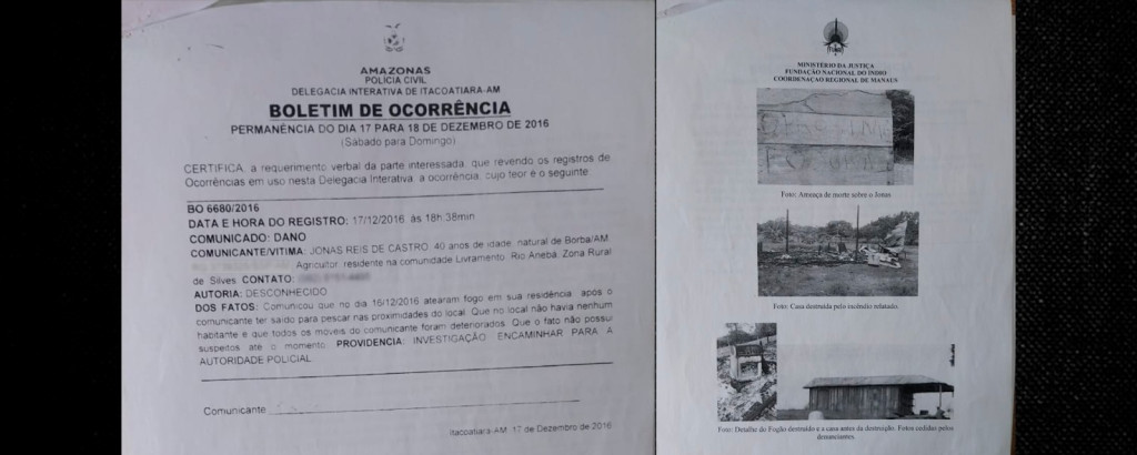 A reportagem teve acesso ao Boletim de Ocorrência (BO 6680/2016), registrado na Delegacia de Itacoatiara e o caso também foi reportado à Fundação Nacional dos Povos Indígenas (Funai). Em uma das páginas do registro está anexada a foto com a seguinte frase, deixada pelos autores do crime: “O próximo é o Jonas”.