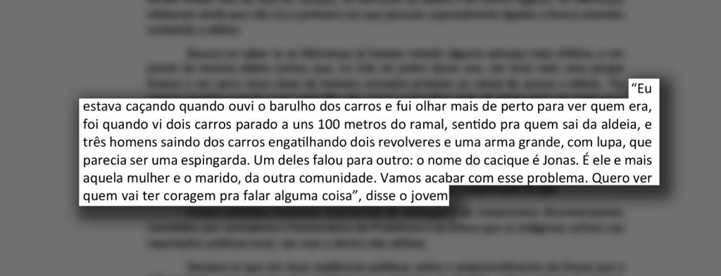 “Eu estava caçando quando ouvi o barulho dos carros e fui olhar mais de perto para ver quem era, foi quando vi dois carros parados a uns 100 metros do ramal, sentido pra quem sai da aldeia, e três homens saindo dos carros engatilhando dois revólveres e uma arma grande, com lupa, que parecia ser uma espingarda. Um deles falou para outro: o nome do cacique é Jonas Mura. É ele e mais aquela mulher e o marido, da outra comunidade. Vamos acabar com esse problema. Quero ver quem vai ter coragem pra falar alguma coisa”, disse o jovem, conforme trecho do relatório da CPT.