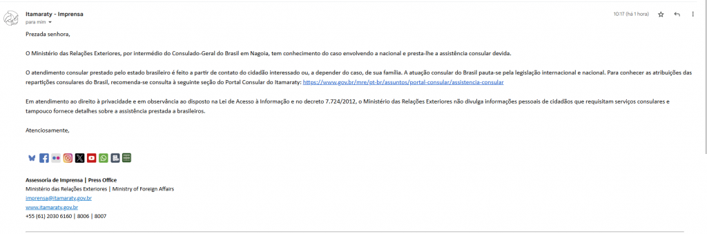 A CENARIUM entrou em contato com a assessoria do Itamaraty sobre o caso. A pasta informou que, por intermédio do Consulado-Geral do Brasil em Nagoia, o ministério tem conhecimento do caso envolvendo a amazonense e está prestando a assistência consular devida.