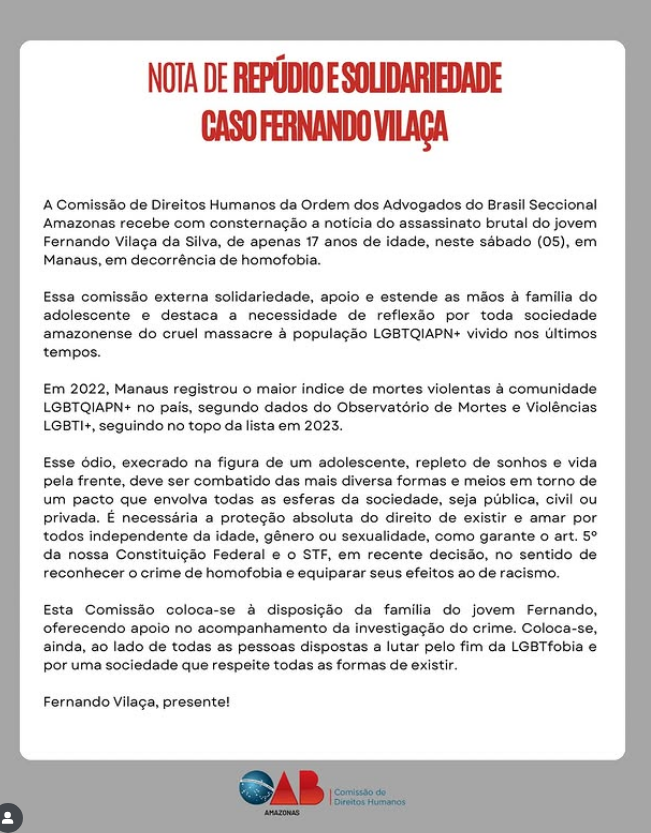 “A Comissão de Direitos Humanos da Ordem dos Advogados do Brasil Seccional Amazonas recebe com consternação a notícia do assassinato brutal do jovem Fernando Vilaça da Silva, de apenas 17 anos de idade, neste sábado (05), em Manaus, em decorrência de homofobia“, alegou a instituição.